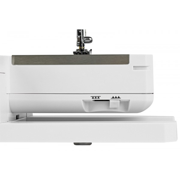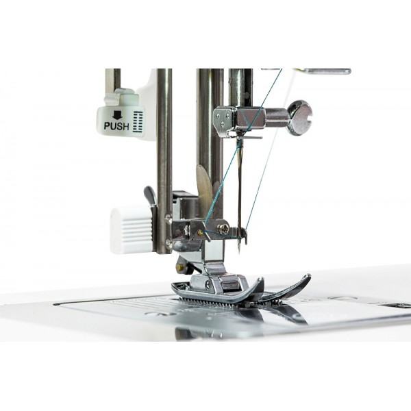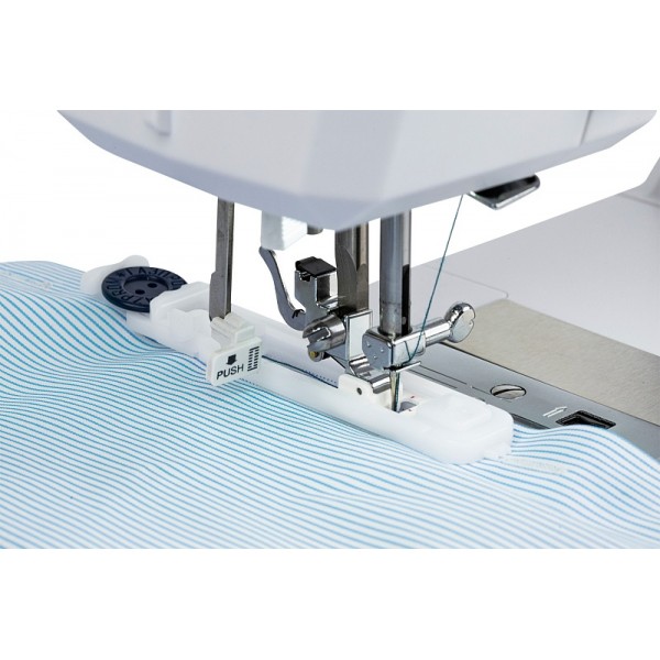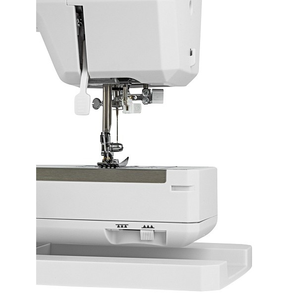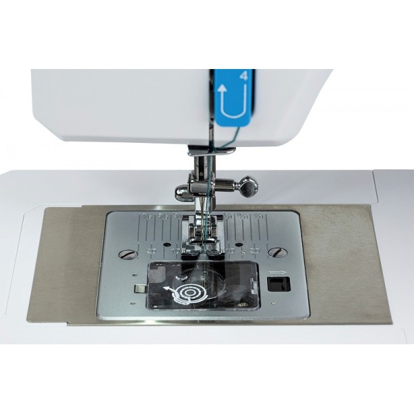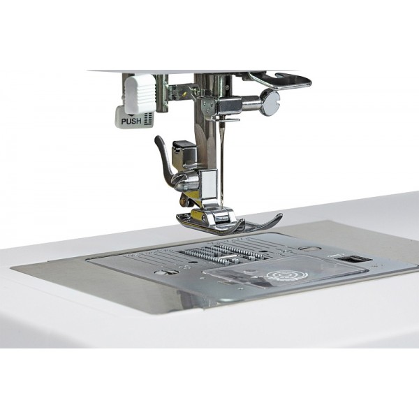 Библиотека операций состоит из 34 вариантов, среди которых петля-автомат, выполняемая со специальной лапкой. Быстро подготовить машину к работе поможет нитевдеватель. Среди доступных регулировок стоит отметить настройку скорости шитья и яркость подсветки, которые выполняются на электронной панели управления. Есть возможность настроить положение иглы в момент остановки шитья (верх/низ). Для отключения нижнего транспортера во время штопки или пришивания пуговиц используется переключатель на задней части корпуса. Машина имеет рукавную платформу и поддерживает установку двойной иглы.