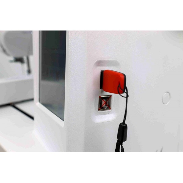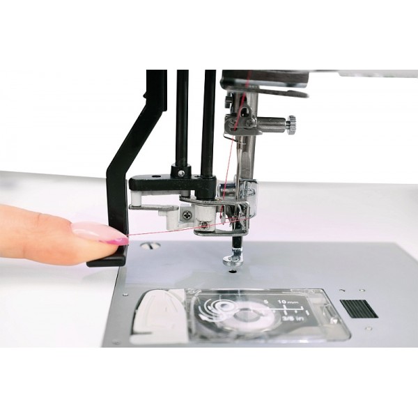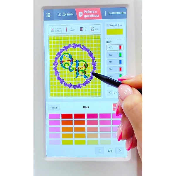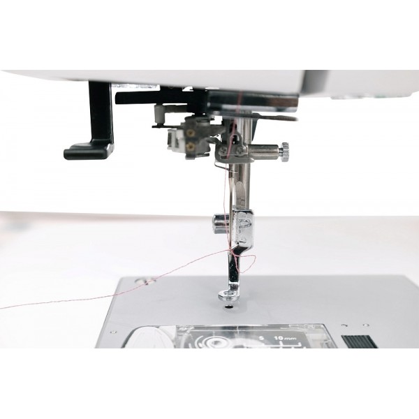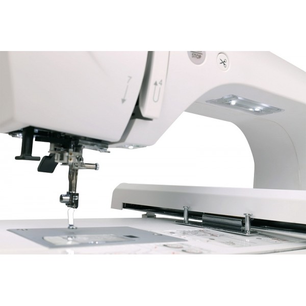Машина использует горизонтальный тип челнока с "быстрой" системой обрезки нити. Конструкция включает улучшенный нитевдеватель автоматического типа и регулируемую по яркости подсветку из 5 светодиодов. В памяти устройства уже записано 156 дизайнов, а также 9 вариантов шрифтов, специальные рамки для монограмм и различные варианты оформления букв. Все настройки удобно выполнять на сенсорном цветном мониторе с диагональю 7 дюймов (стилус в комплекте). Меню русифицировано. Програмно можно задать скорость вышивки (до 860 об/мин). Установлены сенсоры, сигнализирующие об обрыве нитей, есть датчик для подсчета стежков. Мастер может выполнять все необходимые операции с фрагментами дизайна, в том числе менять цвет фона или зеркально отражать элементы, а затем сохранять свой вариант в память машины. Есть функция трассировки контура, возврат к началу вышивки, память на последний дизайн до выключения. Новые вышивки можно загружать с USB карты (в комплекте).