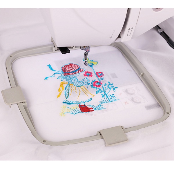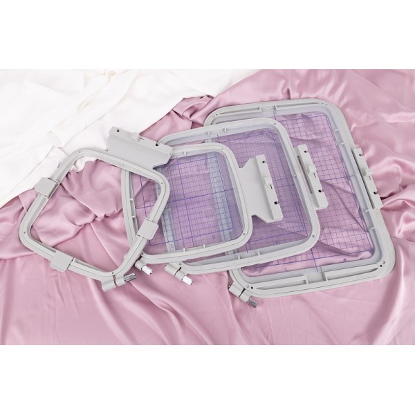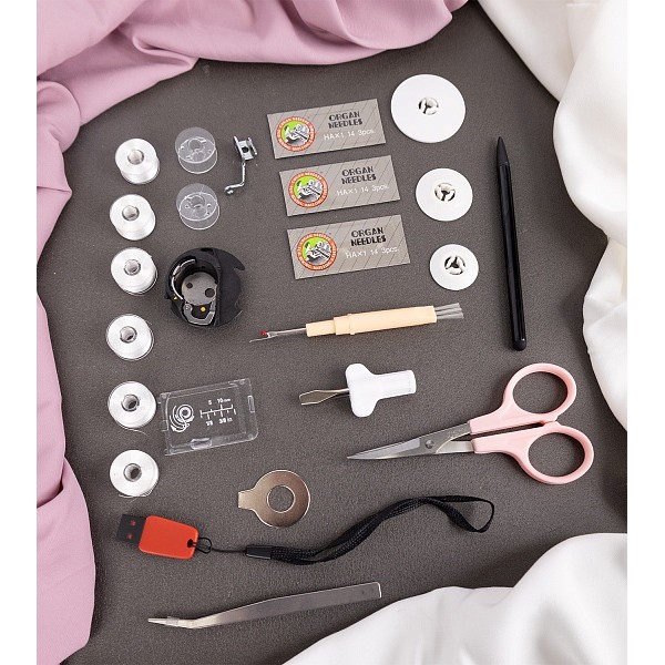 Поставка включает 4 типа пялец, вышивальную лапку и необходимые инструменты для работы. Также прилагается дополнительный столик и мягкий чехол.