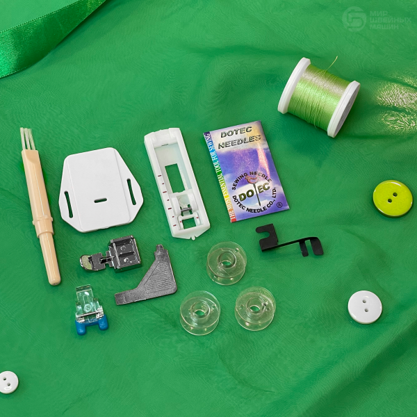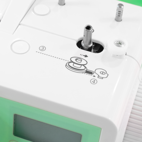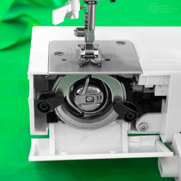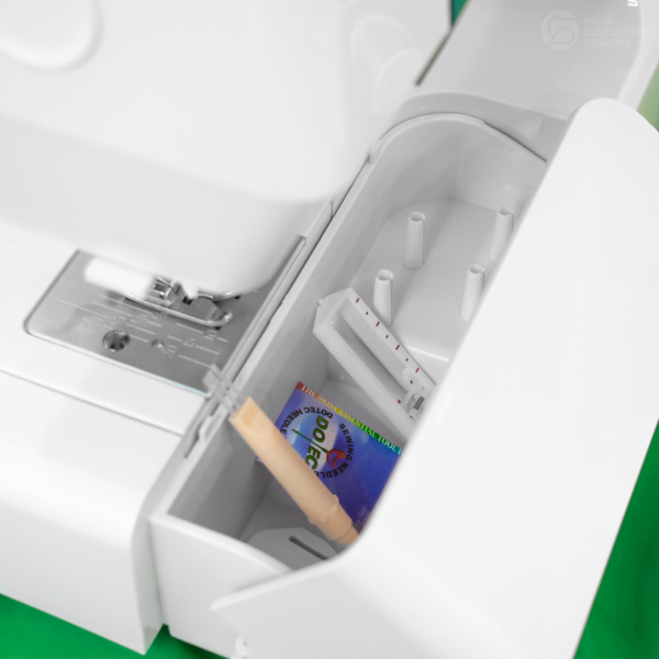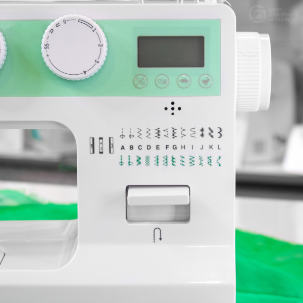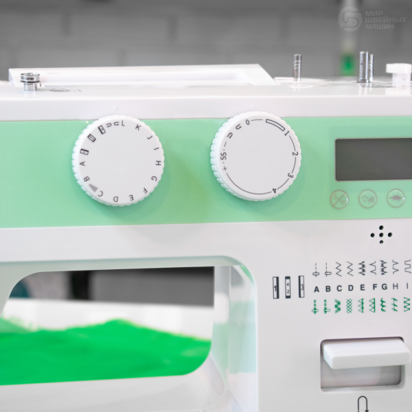 Модель выполняет 25 операций с шириной стежка до 5 мм. Петля выметывается в 4 приема (полуавтомат). Все настройки будут видны на небольшом ЖК-дисплее, а переключение выполняется привычными круглыми регуляторами. Регулировка скорости выполняется двумя кнопками - можно выбрать медленный ход в 20 стежков за минуту или максимальную скорость в 800 стежков в минуту. Особенностью машины является и регулировка освещения - можно выбрать 3 положения яркости или совсем отключить подсветку. Доступна кнопка положения иглы Верх/низ. Комфорт шитью добавляет и продуманный нитевдеватель.