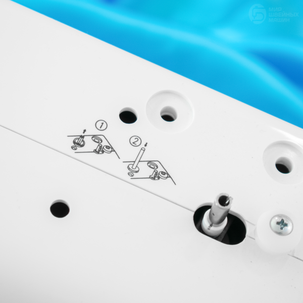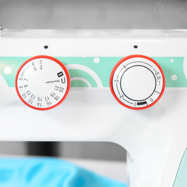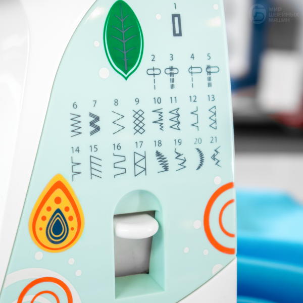 Машина оснащена простым нитевдевателем, имеет удобную рукавную платформу и подсветку рабочей зоны. Переключение операций осуществляется регуляторами с красной противоскользящей поверхностью. Таблица строчек поможет быстро сделать выбор строчки. В арсенале модели есть оверлочная и декоративные варианты обработки, а также петля-автомат. При выполнении штопки или стежки, зубцы транспортера блокируются специальной пластиной. Возможна строчка двойной иглой.