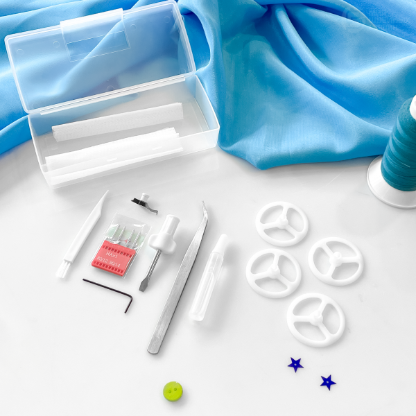 В набор поставки входит защитный чехол и стандартные аксессуары. Купить специальные лапки (для резинки, канта, бисера и т. д.) можно отдельно.