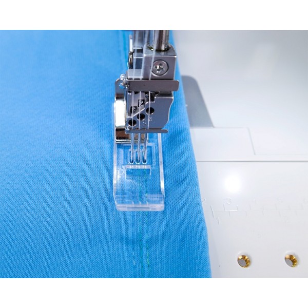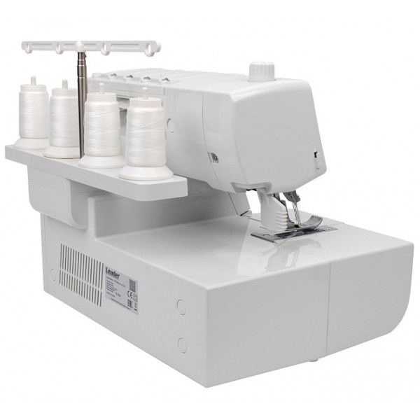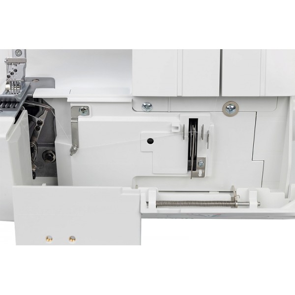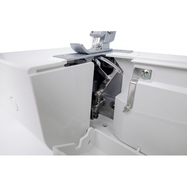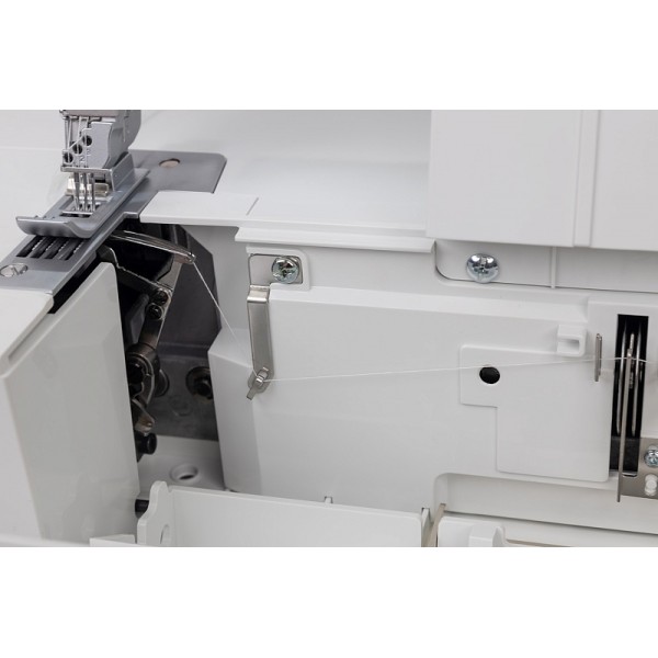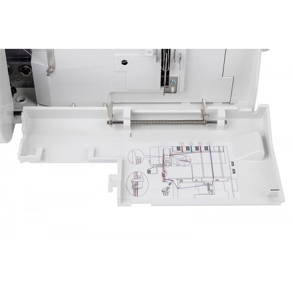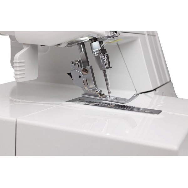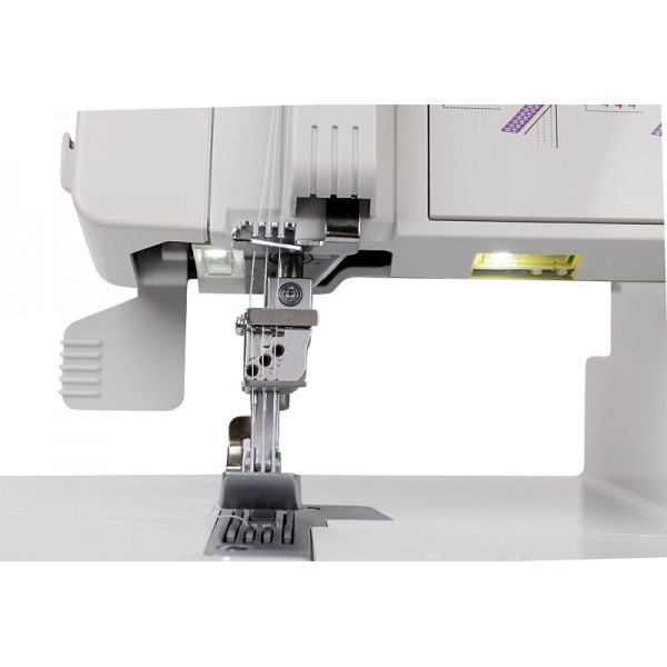 Модель выполняет 7 швов, в том числе цепной стежок. Заправка нитей выполняется по цветовой схеме. Предусмотрена блокировка двигателя при открытой крышке и поднятой вверх прижимной лапке. Мастер может выполнять строчку на скорости до 1200 ст/мин. Установлена яркая светодиодная подсветка.