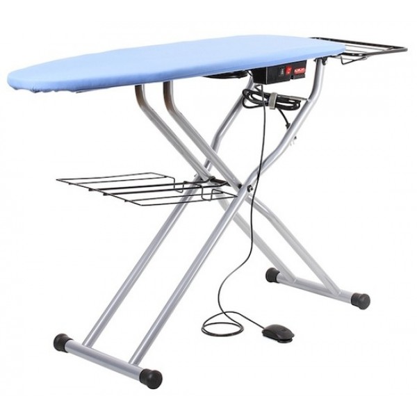 Стол имеет подставку под утюг и встроенную розетку для его подключения. Высоту рабочего места можно отрегулировать до 97 см. Готовое бельё будет удобно сложить на широкую полку под столом.