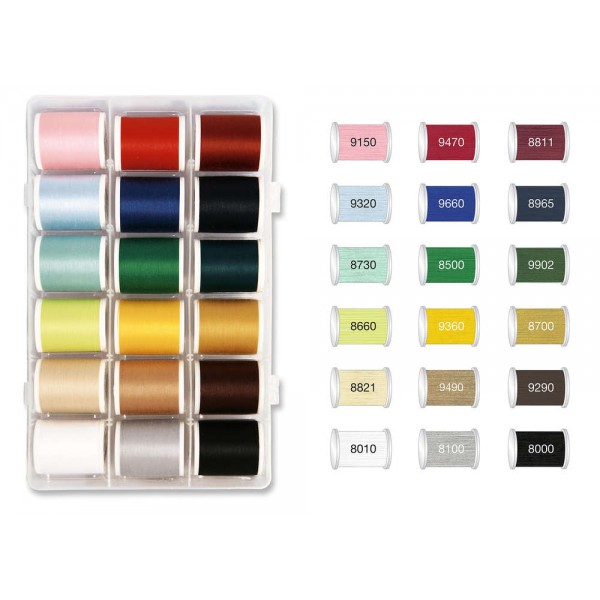 Нитки универсального применения для всех типов машин. В набор входит 18 разных цветов.