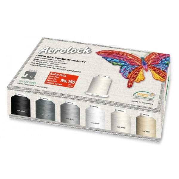 Двадцать четыре бобины прочных нитей для оверлока. В наборе представлены шесть цветов (универсальных оттенков).