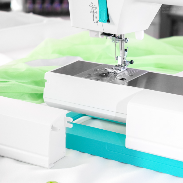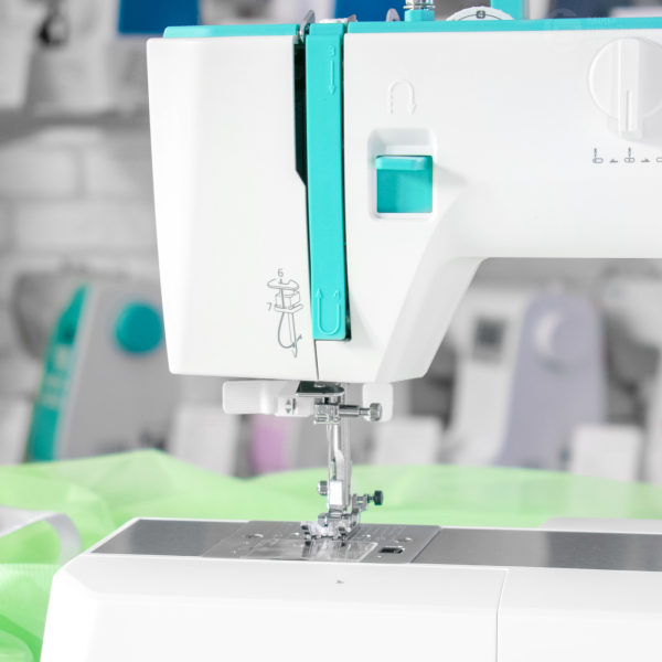 Машина выполняет строчки всех типов с шириной зигзага до 6 мм, а прорезную петлю можно обметать за один прием (автомат). Классический нитевдеватель ускорит заправку верхней нити, а намотка шпульки выполняется с автоматической блокировкой мотора. Рабочая поверхность выполнена с металлический покрытием и увеличенной шириной справа от иглы. Предусмотрен переключатель положения иглы относительно центра (вправо/влево) и рычаг реверса. Машина работает с высокой скоростью (до 1000 ст/мин). Есть возможность отрегулировать силу давления лапки и отключить передвижение зубцов нижнего транспортера.
