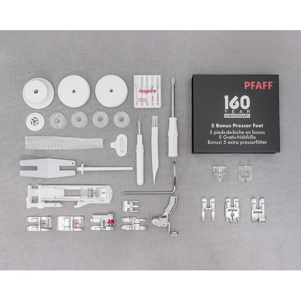 Дополнительный подарок - набор из 5 лапок, которые расширяют возможности в шитье и декоре. Базовая комплектация состоит из 7 лапок, инструментов для обслуживания и жесткого футляра.