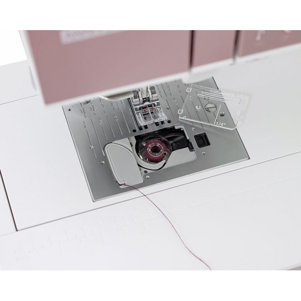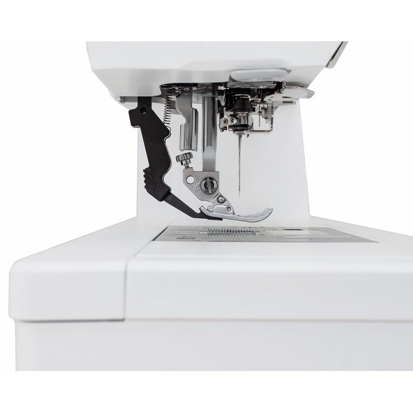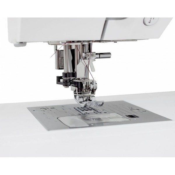 Ширина рабочего места вправо от иглы составляет целых 20 см, которые ярко подсвечены светодиодами. Модель оборудована встроенным верхним транспортером системы IDT - визитной карточкой бренда. Двойная подача обеспечивает равномерное передвижение изделия из нескольких слоев ткани - то, что необходимо для квилтинга и пэчворка. Сенсорный дисплей позволяет легко выбрать нужную программу и задать все параметры строчки. Машина поддерживает функцию зеркального отображения, совмещение швов и сохранение в память созданного шва. Конструкция включает нитевдеватель с полуавтоматической заправкой - только нажатие на рычаг заправляет нитку в иглу.