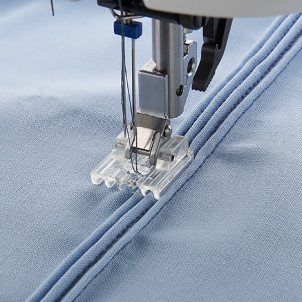 Пять желобков на подошве этой прозрачной лапки помогут получить параллельные тонкие защипы для отделки изделия. Используется с двойной иглой (интервал 2 мм).