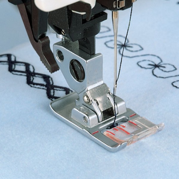 Для выполнения декоративных строчек лучше установить специальную лапку. На ней есть отметки для лучшего контроля и желобок на подошве, чтобы легче проходить плотный застил.