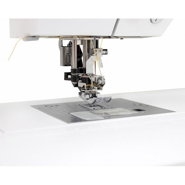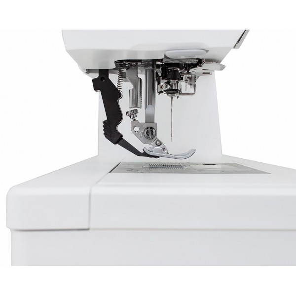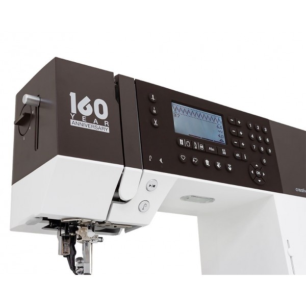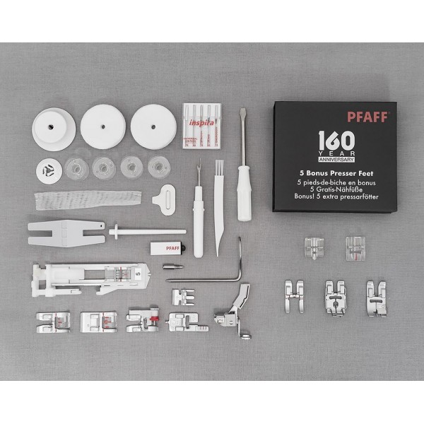 В честь юбилея расширена и комплектация машины. Набор лапок состоит из 12 вариантов, среди которых лапки для пэчворка, канта и подгибки. Для хранения прилагается жесткий чехол.