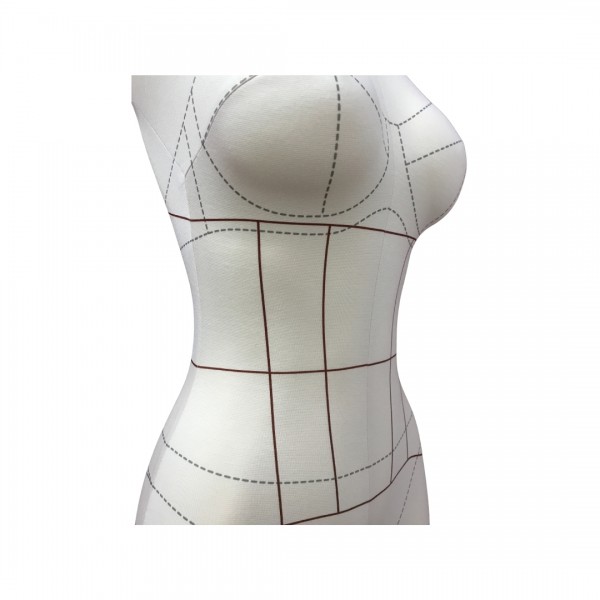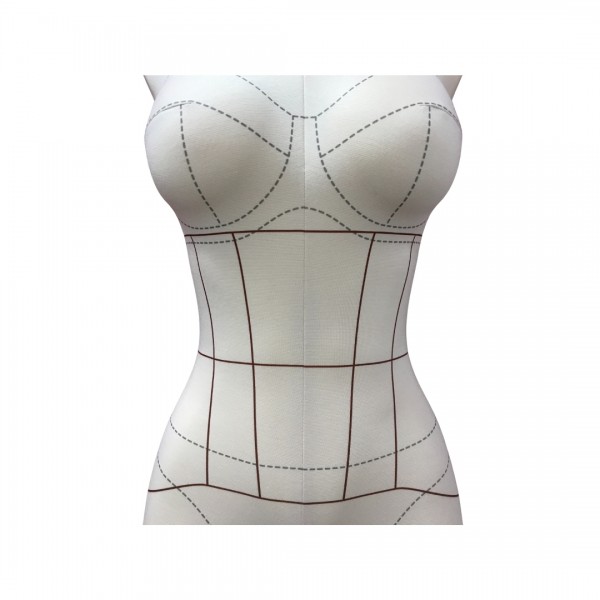 На поверхности съемного чехла из трикотажа Милано нанесены разметочные линии (сублимационная печать). Благодаря упругой основе (в три раза мягче обычного) манекен легко стянуть корсетом в талии на 10 см. Манекен отлично переносит наколку и ВТО. В комплект входит современная подставка на роликах, а также два чехла (светлый и черный).