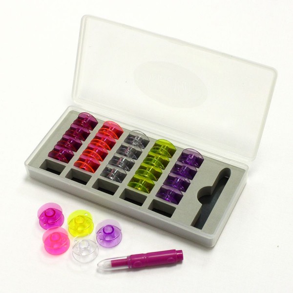 Качественный пластиковый бокс, в котором находятся двадцать пять разноцветных шпулек и удобный нитевдеватель.