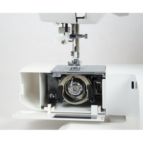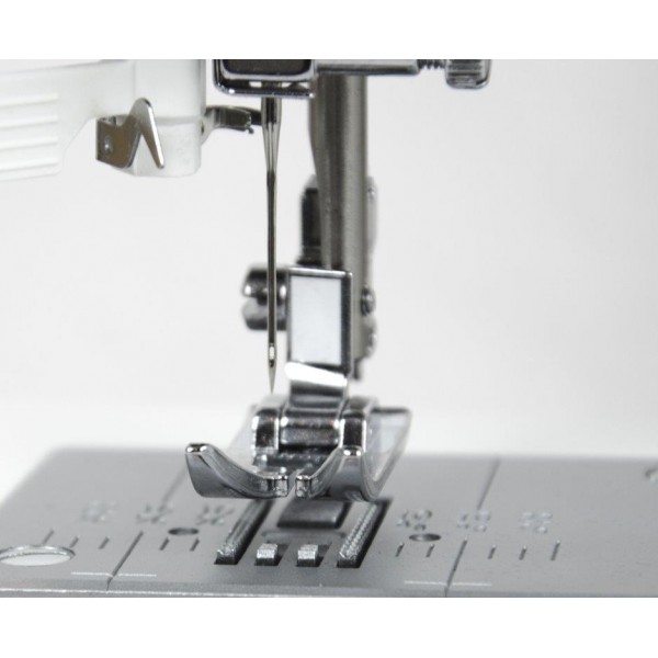 Максимальная ширина выполняемых строчек невелико для электронных моделей – 5 мм, а вот число вариантов обработки прорезной петли уже радует – 6. Настройки всех операций видны на монохромном дисплее. За комфорт шитья отвечает нитевдеватель, яркое освещение вокруг лапки и удобная рукавная платформа для шитья узких деталей. Отличительной чертой машины является приставной столик, на котором будет удобно шить большие изделия. Если понадобится отключить нижний транспортёр, нужно установить штопальную пластину. Есть переключатель направления шитья (реверс) и возможность монтажа двойной иглы.